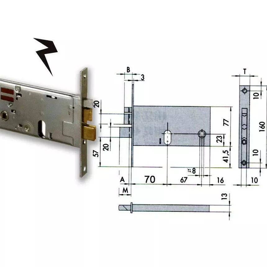 Cisa 14460.70.0 Elettroserratura da infilare per fasce, per cilindro ovale, scrocco reversibile, scrocco e mandata autobloccante, fermo a giorno, quadro maniglia, alimentazione 12V. Dimensioni: entrata mm.70.
