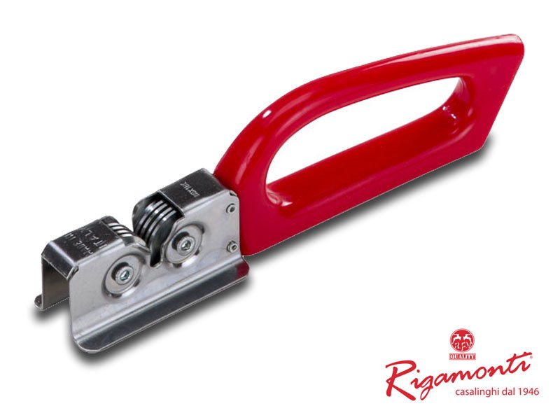 Con dischi affilanti in acciaio carbonitrurato e rettificato. Corpo in acciaio inox. Impugnatura in polipropilene.