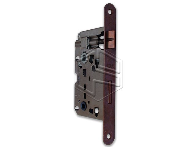 AGB Serratura patent B00579.50 piccola a doppio quadro per bagno , frontale mm.20, entrata mm.50, interasse mm.70, con bordo tondo, in acciaio bronzato.