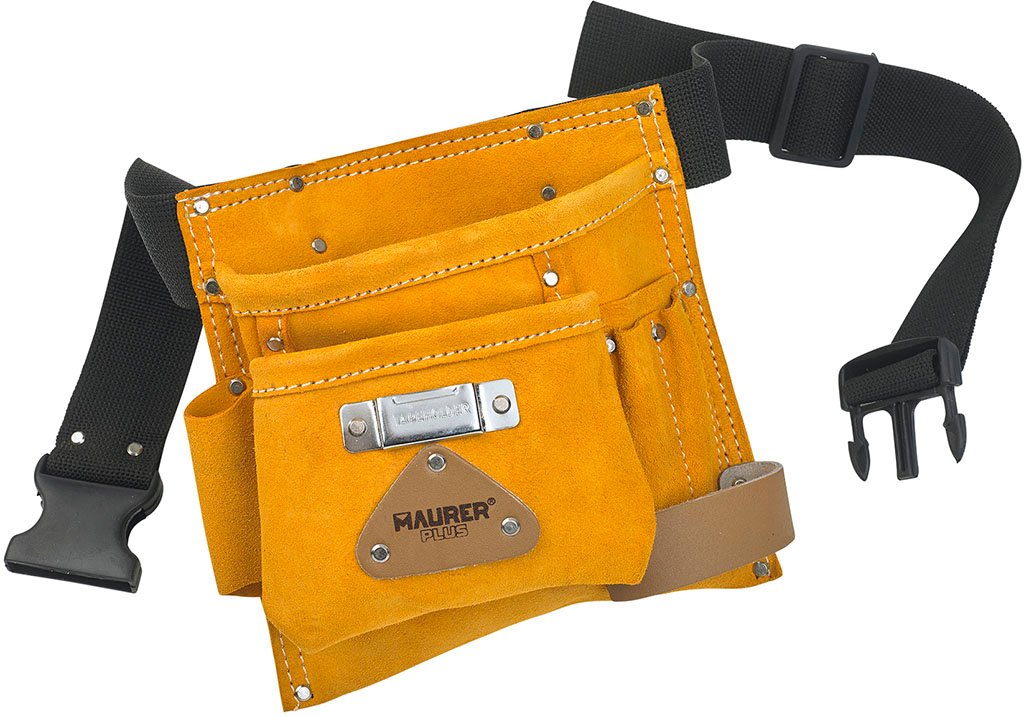 Borsa porta attrezzi MAURER per carpentieri, in crosta scamosciata – cinghia regolabile, 2 tasche: 1 larga + 1 media, asole per martello + portatenaglia