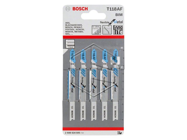 Bosch lame per seghetto alternativo. Legenda ME=metalli non ferrosi,LE=legno,truciolari, ecc.,PX=plexiglas, PL=plastica,AL=alluminio. Lunghezza complessiva mm. 92. Altezza di taglio min/max mm. 1/ 3. Per lamiere sottili, lamiere forate. T118AF. Confezione 5pz.