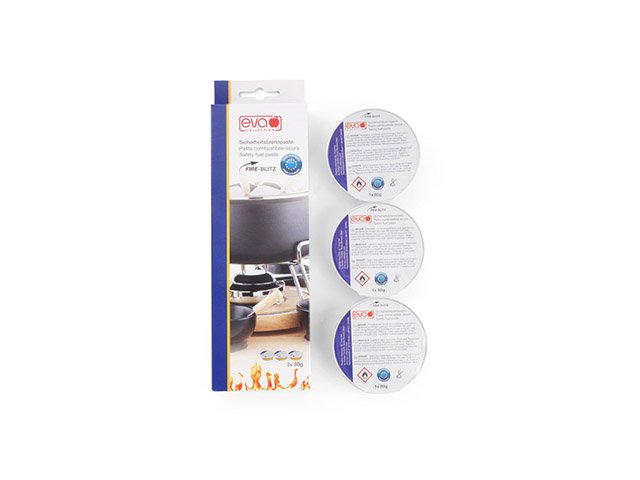 Pasta combustibile Fire Blitz(etanolo) Confezione 3 vaschette da 80 g durata di ciascuna vaschetta: 45 minuti istruzioni d’uso e prescrizioni di sicurezza sul retro della confezione.