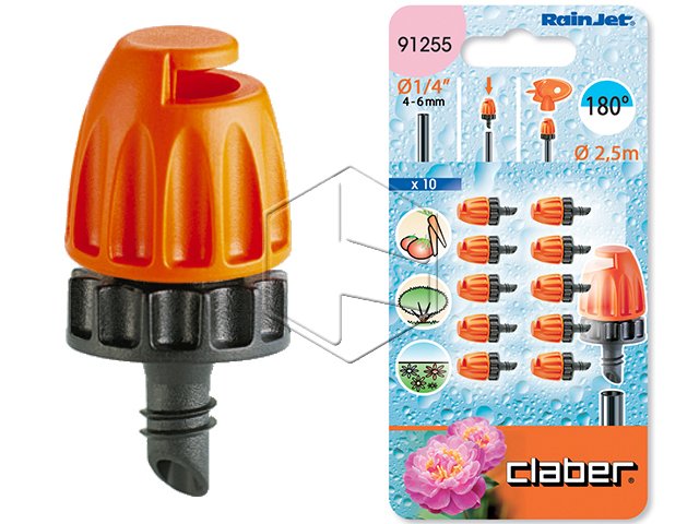 Claber 91555 Microirrigatore 180°. Si applica sul tubo collettore da 1/2 (13-16 mm), sul tubo capillare da 1/4 ( 4- 6 mm) o sulle astine. Per irrigare superfici a semicerchio. Blister da 10 pz.