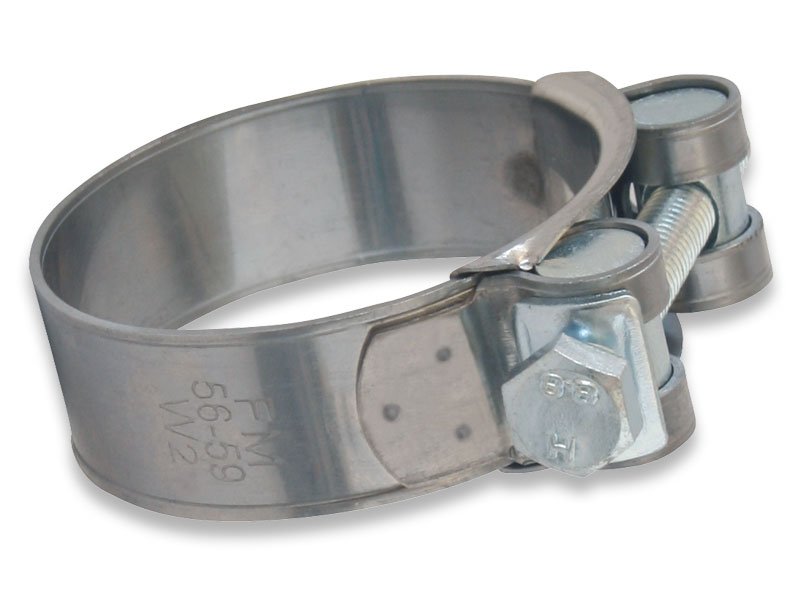 Collare a bullone. Banda e ponte inox AISI 430. Vite TE e cilindri filettati: cl. 8.8. Zincatura bianca. Utilizzabile in ambienti aggressivi. Eccellente tenuta. Per medie e alte pressioni