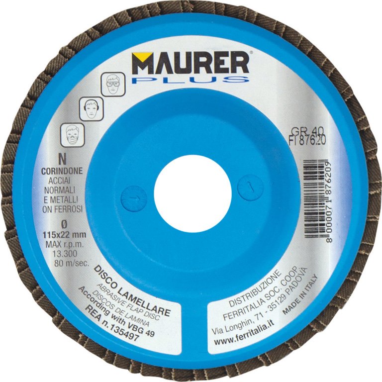 Disco abrasivo lamellare al corindone (ossido di alluminio) MAURER PLUS – flessibile – per operazioni di sbavatura e finitura di metalli, alluminio, bronzo, metalli non ferrosi – supporto in plastica – diam. 115 mm