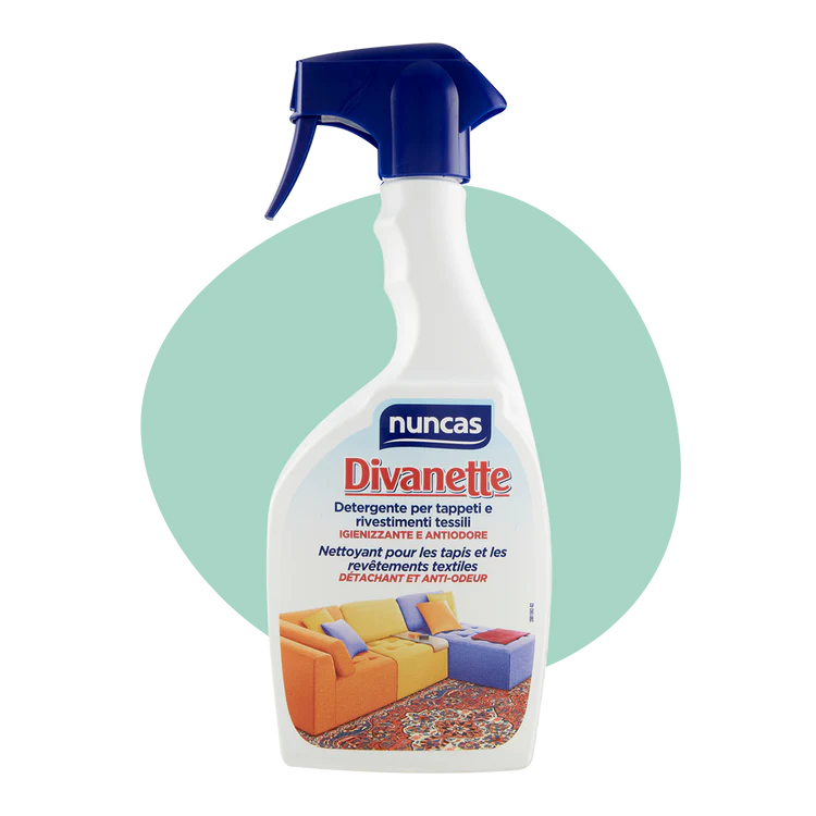 Divanette è il detergente deodorante per eliminare velocemente la polvere, ravvivare i colori e deodorare tutti i tessuti d’arredo.