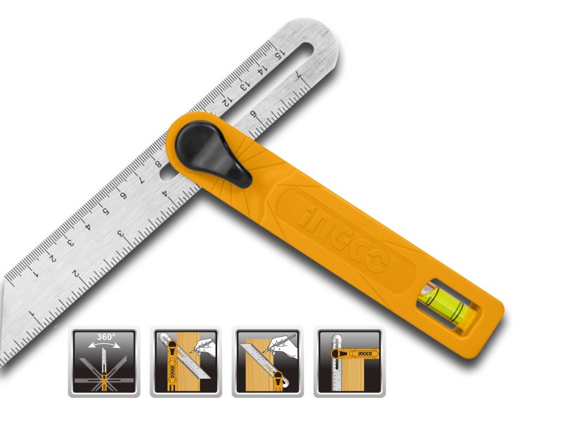 Falsa squadra da 150mm con bolla orizzontale, lama e bullone in acciaio INOX. Angoli fino a 75°