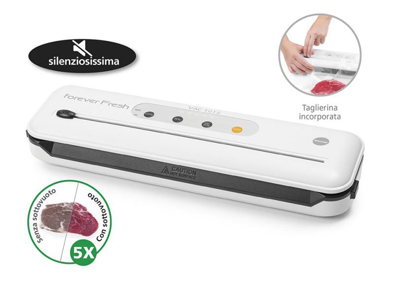 Pratica taglierina incorporata che permette di effettuare tagli precisi. Dotata di funzione per eseguire il vuoto con barattoli. Tubicino e barattoli non inclusi nella confezione