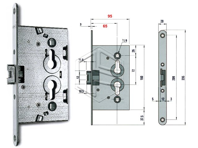 Nemef PN5C00165 Serratura Cantina mm.65,catenaccio a 1 mandata, scrocco in zama,quadro maniglia mm.8.