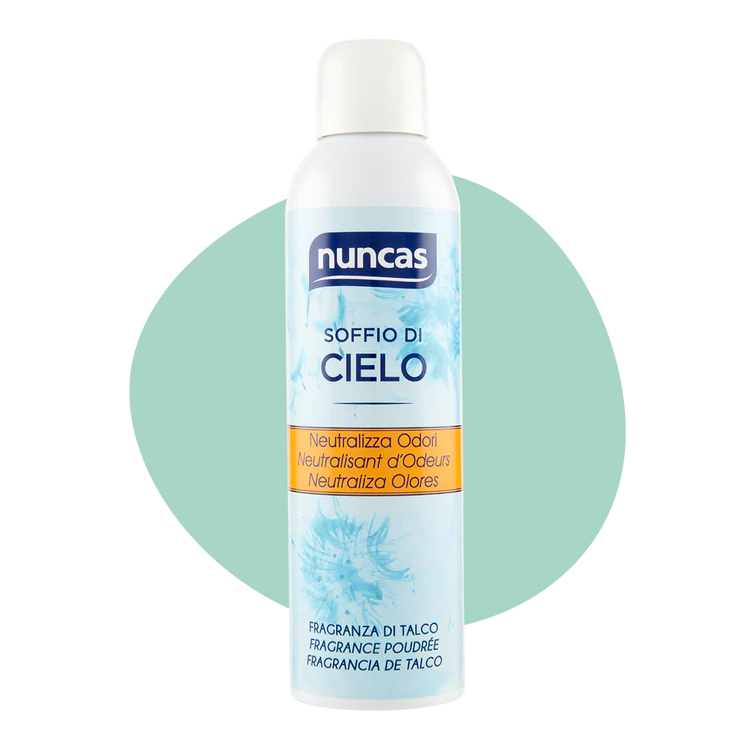 Neutralizza Odori Soffio di Cielo di Nuncas debella completamente tutti gli odori sgradevoli e rinfresca l’aria con un delicato profumo di talco.