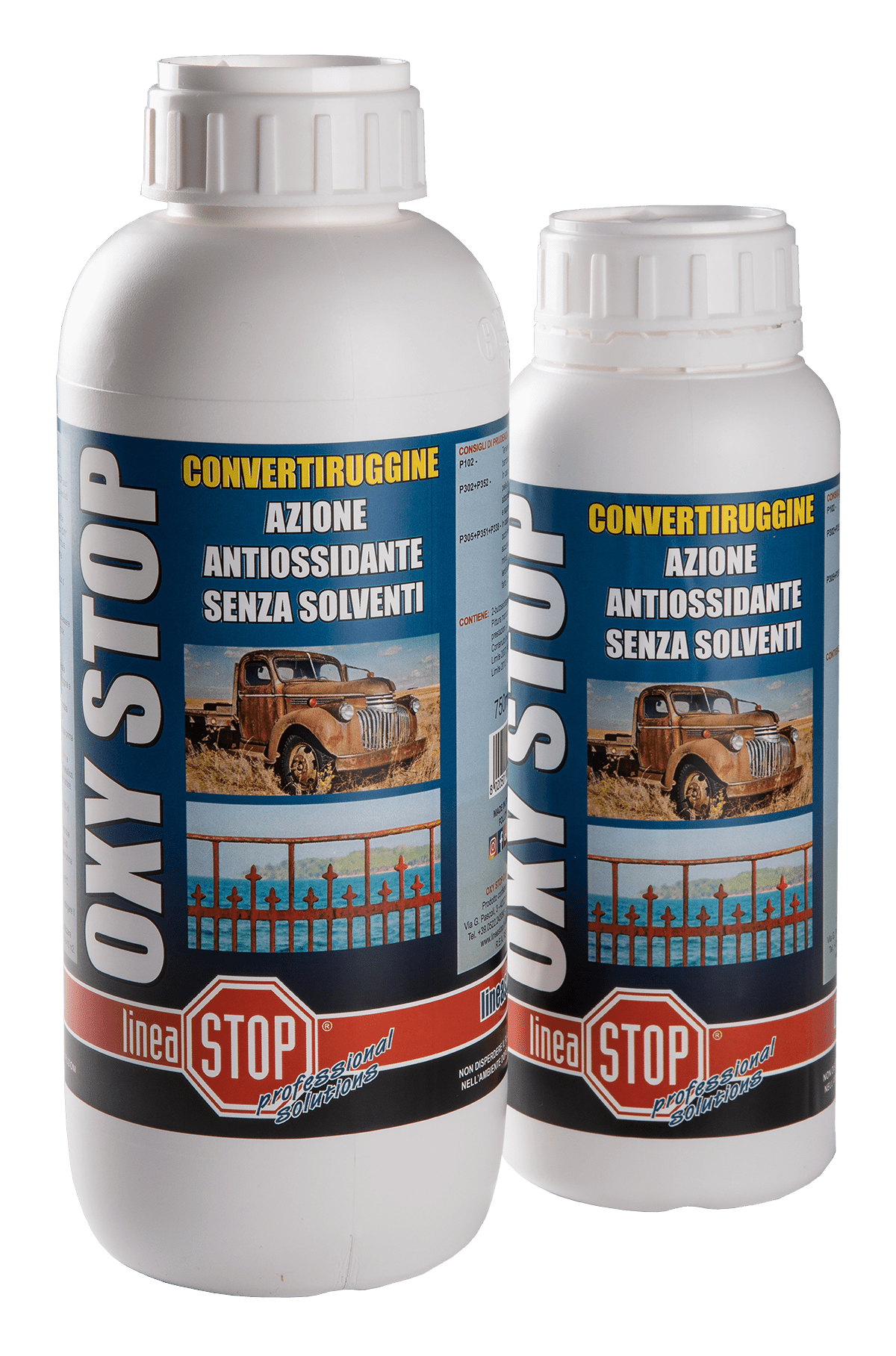 E’ un convertiruggine che blocca e stabilizza il processo di ossidazione prevenendo la ruggine e trasformandola ove presente in un composto stabile. Successivamente la superficie trattata con Oxy Stop, può essere sovra verniciata con qualunque tipo di vernice ad acqua o a solvente.