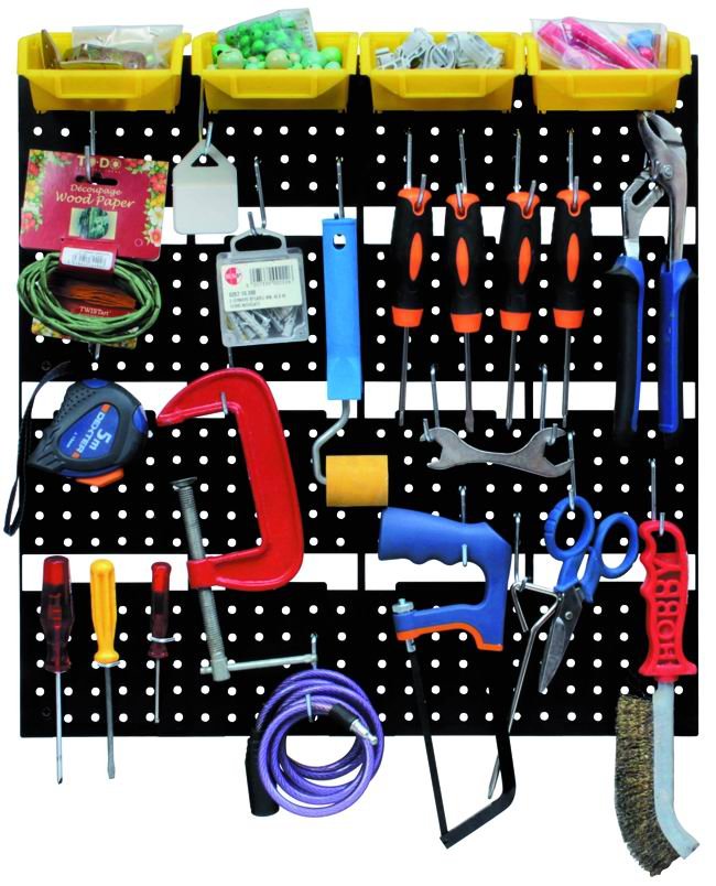 PANNELLI FORATI EXPO – in plastica, aggancio modulare, 4 vaschette e 15 ganci in ferro, dimensioni varie, 50×50 cm (utensili non inclusi)