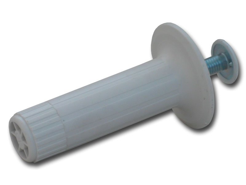 Piedino in ABS colore bianco Ø 28 x H100 mm, regolabile 0/20 mm, con vite di fissaggio. Ø base di fissaggio 60 mm.