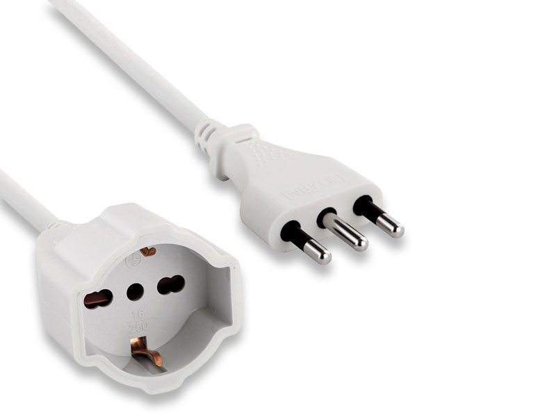 Prolunga con spina 16A e presa polivalente (schuko +10/16A). Cavo HO5 VV-F sezione 3G1,5 mm² lunghezza 10 metri. Tutte le prese sono dotate di children safety – impedisce di introdurre corpi estranei nella presa in tensione.