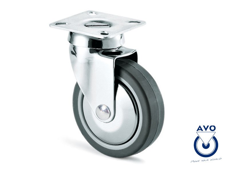 Supporto girevole in acciaio stampato rotante su doppia corona di sfere in acciaio. Esecuzione cromata lucida. Ruota in gomma sintetica grigia flangiata in termoplastico con parafili in acciaio stampato cromato lucido