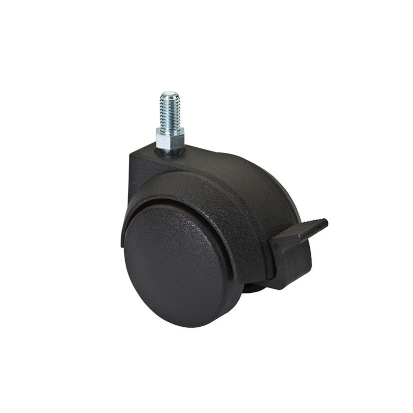 Ruota piroettante gemellata realizzata in nylon, ideale per carrellini e mobiletti e per tutti tipi di pavimenti da interno non delicati. Misura Ø 50 mm. Dotata di attacco tramite perno, con freno integrato.