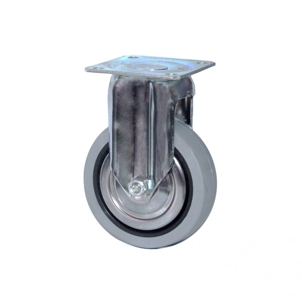Ruota realizzata in gomma ideale per pavimenti da interno ed esterno. Fissaggio tramite piastra fissa da 60×60 mm. Corpo in lamiera cromata, ruota in gomma grigia