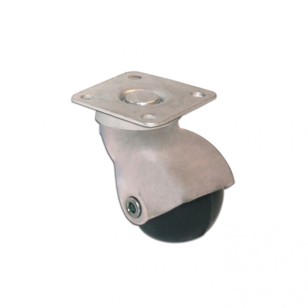 Ruota sferica piroettante realizzata in gomma, colore nero, ideale per pavimenti da interno anche delicati. Ideale per comodini, cassettiere, mobiletti, carrellini, tavolini. Fissaggio tramite piastra da 43×43 mm. Corpo in acciaio cromato.