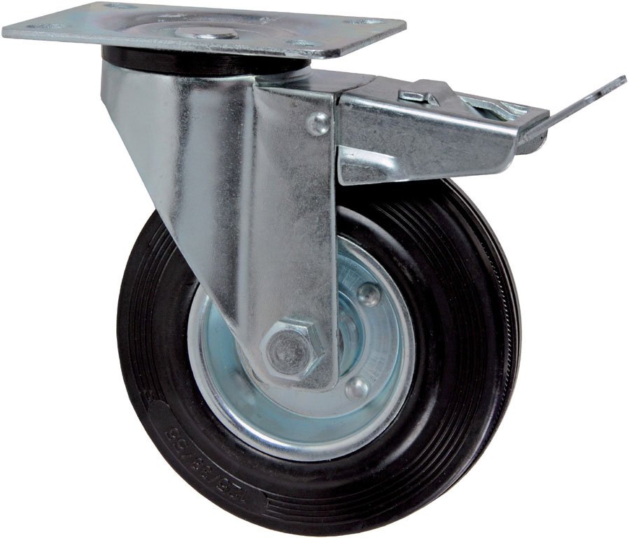 Ruota in gomma nera MAURER – dischi in lamiera con cuscinetti a rulli – con supporto rotante zincato a piastra leggero e freno