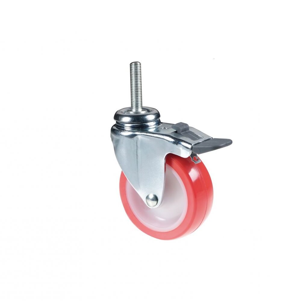 Ruota piroettante, ideale per pavimenti in piastrelle, cemento e linoleum. Dotata di attacco tramite perno M10 x 25 mm, freno integrato. Corpo in lamiera zincata, ruota con nucleo in poliammide e rivestimento in poliuretano rosso.