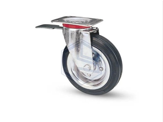 Ruota industriale con rivestimento in gomma e flange in acciaio. Su piastra girevole, con freno. Articolo 80/Bis. art. 8692-8693-8694-8695 piastra 100x 85art. 19513 piastra 140×110.