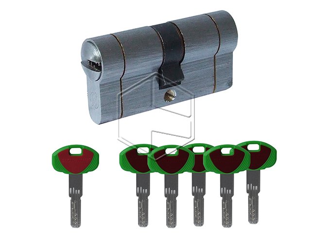 Securemme K22 doppio cilindro di sicurezza, in ottone nichelato, a 11 spine, pin UNICO antibump, camma DIN 30°. Fornito con CODE CARD, 1 chiave cantiere e 5 chiavi padronali, vite mm.85. Chiavi duplicabili esclusivamente dai TEAM SECUREMME. CORPO CILINDRO NON MODULARE.