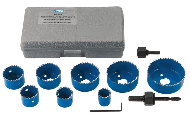 Set di frese a tazza per legno La valigetta contiene 8 pezzi delle seguenti misure: Ø 20 mm, 26 mm, 30 mm, 35 mm, 40 mm, 50 mm, 55 mm, 67 mm