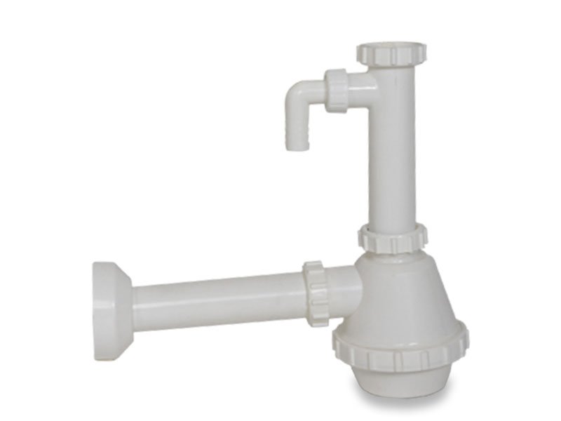 Senza piletta. Tipo fiasco, per lavelli, con attacco lavatrice e tappo.