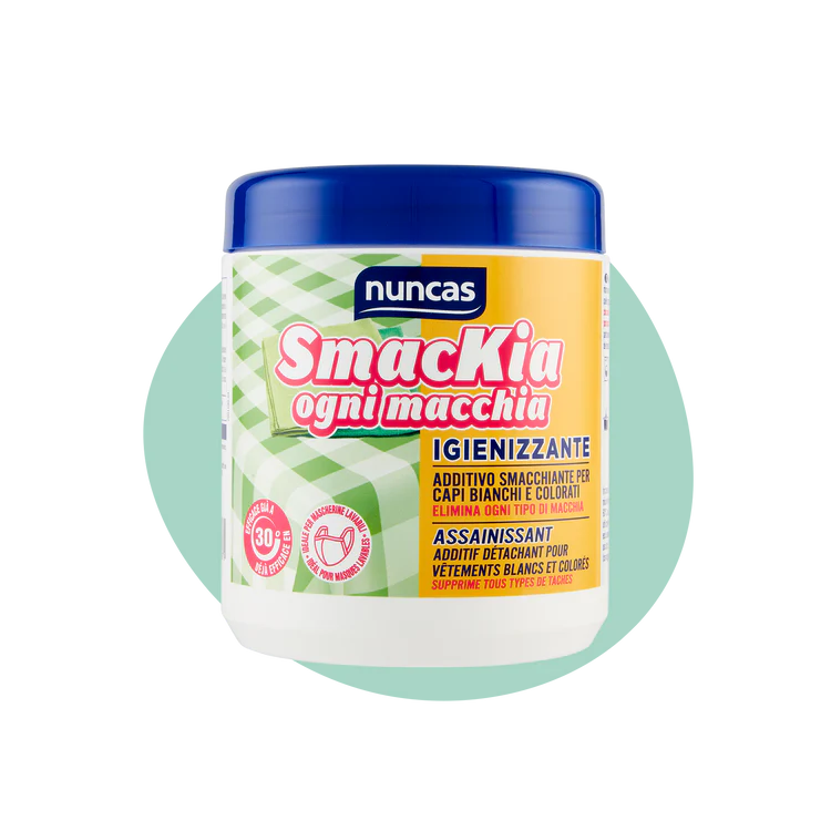 Per un bucato perfetto c’è bisogno di un perfetto smacchiatore per bucato. Il giusto alleato che, abbinato al detersivo, riesca a cancellare anche le macchie più resistenti: sugo, erba, vino, frutta… Per ottenere un risultato impeccabile non serve ricorrere a rimedi improvvisati, ci vuole precisione e metodo. Affidati con sicurezza ai detersivi specifici per il bucato di Nuncas anti macchia: pratici, essenziali, efficaci già alle basse temperature e nei cicli brevi delle lavatrici di oggi, programmate per consumare meno acqua e meno energia. Nella vasta gamma di prodotti per la casa, Nuncas ha creato Smackia ogni macchia, l’additivo smacchiante per bucato di nuova generazione ideale per smacchiare in un solo lavaggio tutto il bucato, sia a mano che in lavatrice. La sua formula igienizzante con ossigeno attivo lo rende particolarmente ideale per il lavaggio dei tessuti che entrano in contatto con germi e batteri, come le mascherine lavabili. Inoltre, l’attivatore del percarbonato garantisce la massima efficacia già a 30°C. Agisce su macchie grasse, colorate o di tipo enzimatico (costituite cioè da proteine e amidi, come ad esempio uovo, panna, cioccolato). Con una sola dose capi puliti e senza aloni!