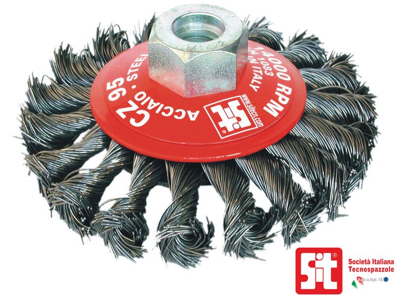 I mazzetti ritorti ne fanno una spazzola aggressiva per rimuovere, ruggine e residui. la forma conica le rende adatte per lavori di taglio su superfici irregolari con spigoli, profili. Filetto M14.
