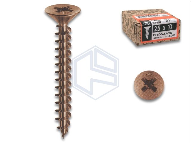 Vite Panel Vit bronzata con testa svasata piana. Adatta per avvitamento senza preforo su pannelli truciolari, legni naturali scuri, elementi di ferramenta bronzati. Trattamento galvanico.