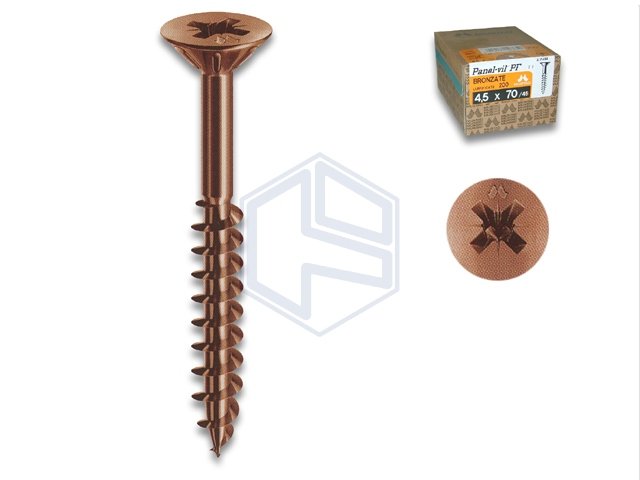 Vite Panel-Vit PF. Testa svasata piana a croce, bronzata. Indicata per realizzare fissaggi tra parti di elevato spessore. Azione svasante delle alette sotto testa per permettere un perfetto alloggiamento.