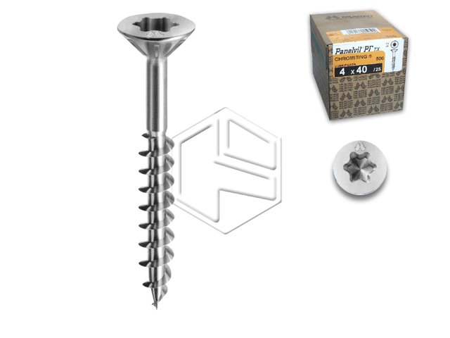 Vite panel-Vit PF. Testa svasata piana a torx, chromiting. Indicata per realizzare fissaggi tra parti di elevato spessore. Azione svasante delle alette sotto testa per permettere un perfetto alloggiamento.