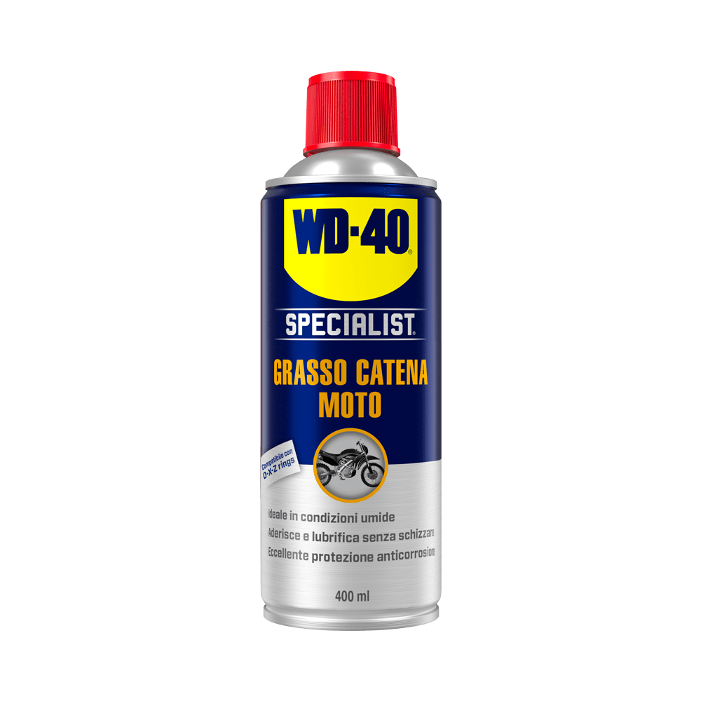 Agitare bene il contenitore prima dell’uso. Tenere la bomboletta in posizione verticale e spruzzare direttamente sulla catena. Lasciare qualche minuto per permettere al grasso di penetrare e addensarsi.